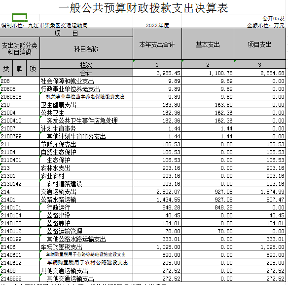 本部门公开“2022年新能源公交车运营补贴”、“2022年疫情防控保障资金”、“2022年致学公司保障资金”、“农村客运、出租车等行业成品油价格改革财政补贴”、“柴桑区高速东出口(思科电子生活区)生态提升工程”、“农村公路安全生命防护工程(火龙村-城子镇)项目”、“2022年政府成品油税费改革转移支付预算(农村公路养护资金)”、“公路桥梁建设”、“农村公路建设”、“四好农村公路建设”项目部门评价报告(见附件《交通部门项目绩效自评总报告》)。