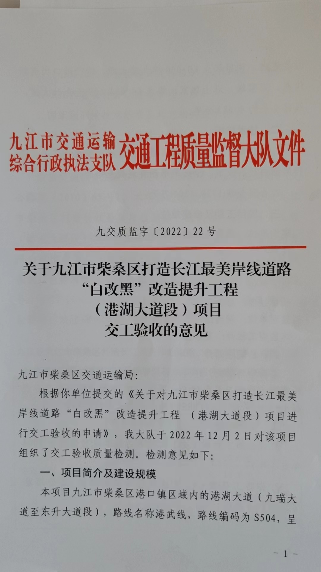 关于九江市柴桑区打造长江最美岸线道路“白改黑”改造提升工程( 港湖大道段 )项日交工验收的意见