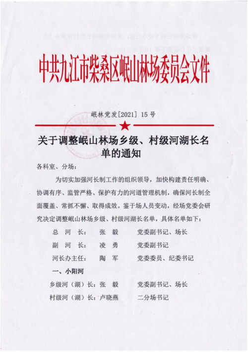 关于调整岷山林场乡级、村级河湖长名单的通知