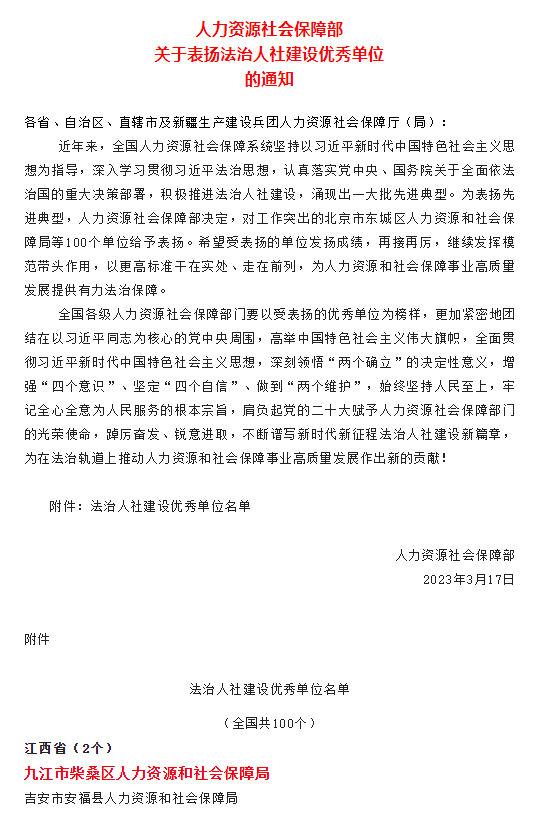 2023年3月柴桑区人社局被人社部评为首批全国“法治人社建设优秀单位”