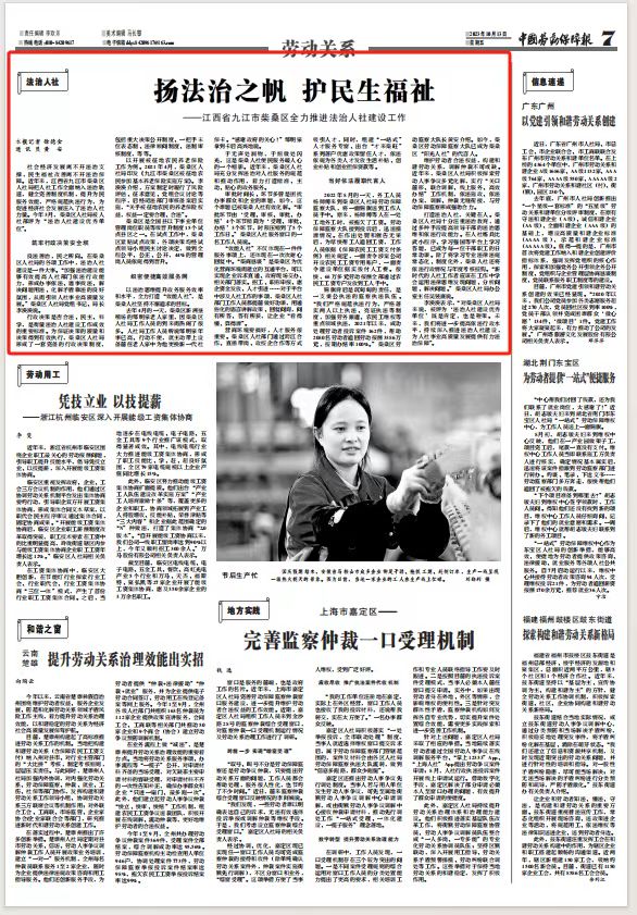 柴桑区人社局法治人社建设工作典型经验被《中国劳动保障报》版面头条报道