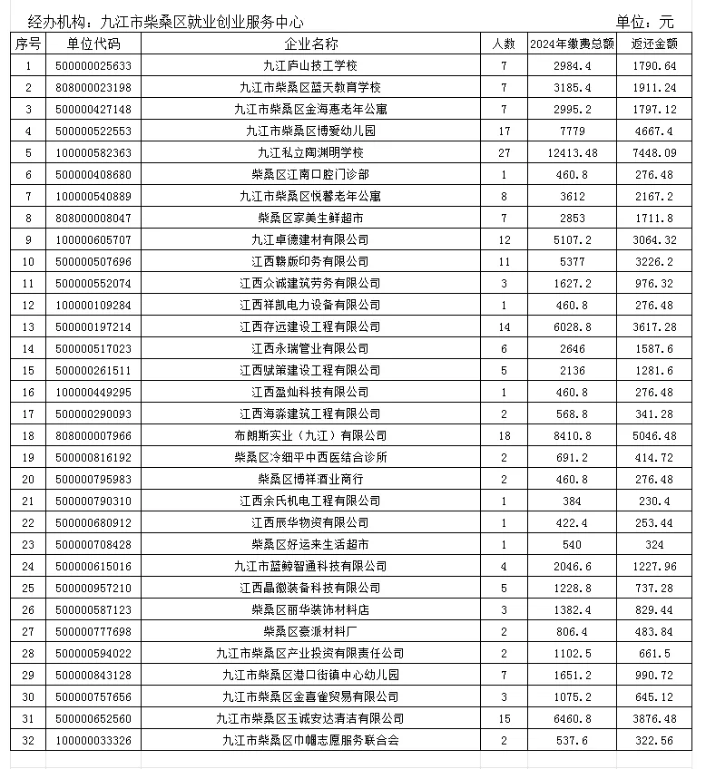 柴桑区2025年一般企业稳岗返还第六批名单公示
