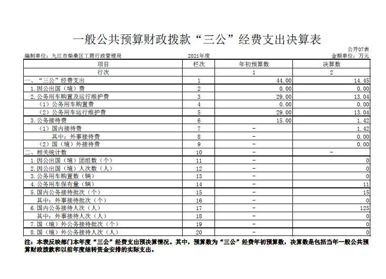 “三公”经费支出:指用一般公共预算财政拨款安排的因公出国(境)费、公务用车购置及运行维护费和公务接待费。其中,因公出国(境)费反映单位公务出国(境)的国际旅费、国外城市间交通费、住宿费、伙食费、培训费、公杂费等支出;公务用车购置及运行维护费反映单位公务用车车辆购置支出(含车辆购置税、牌照费),按规定保留的公务用车燃料费、维修费、过桥过路费、保险费、安全奖励费用等支出;公务接待费反映单位按规定开支的各类公务接待(含外宾接待)支出。