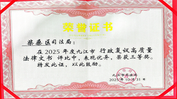 喜报!柴桑区司法局在2025年度九江市行政复议高质量法律文书评比中荣获三等奖