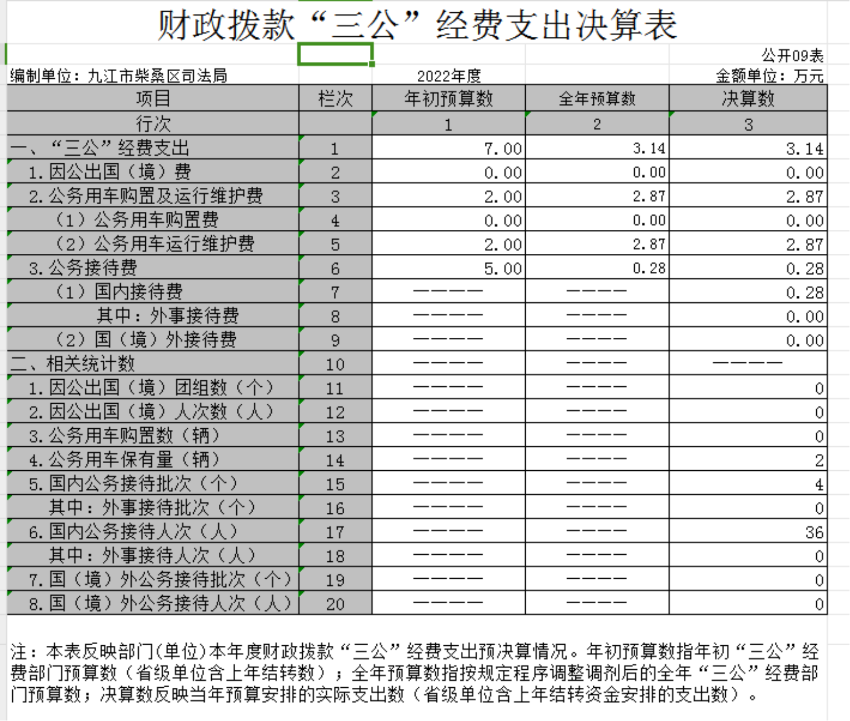 (三)公务用车购置及运行维护费支出2万元,其中公务用车购置全年预算数为0万元,决算数为0万元,完成全年预算的0%,决算数较2021年持平,主要原因是无购置车辆,全年购置公务用车0辆。决算数较全年预算数不变的主要原因是:无购置车辆;公务用车运行维护费支出全年预算数为2万元,决算数为2.87万元,完成全年预算的143%,决算数较2021年增加0.94万元,增长48%,主要原因是公车使用年限长,换轮胎、维修等,年末公务用车保有2辆。决算数较全年预算数增加的主要原因是:维修费增加。