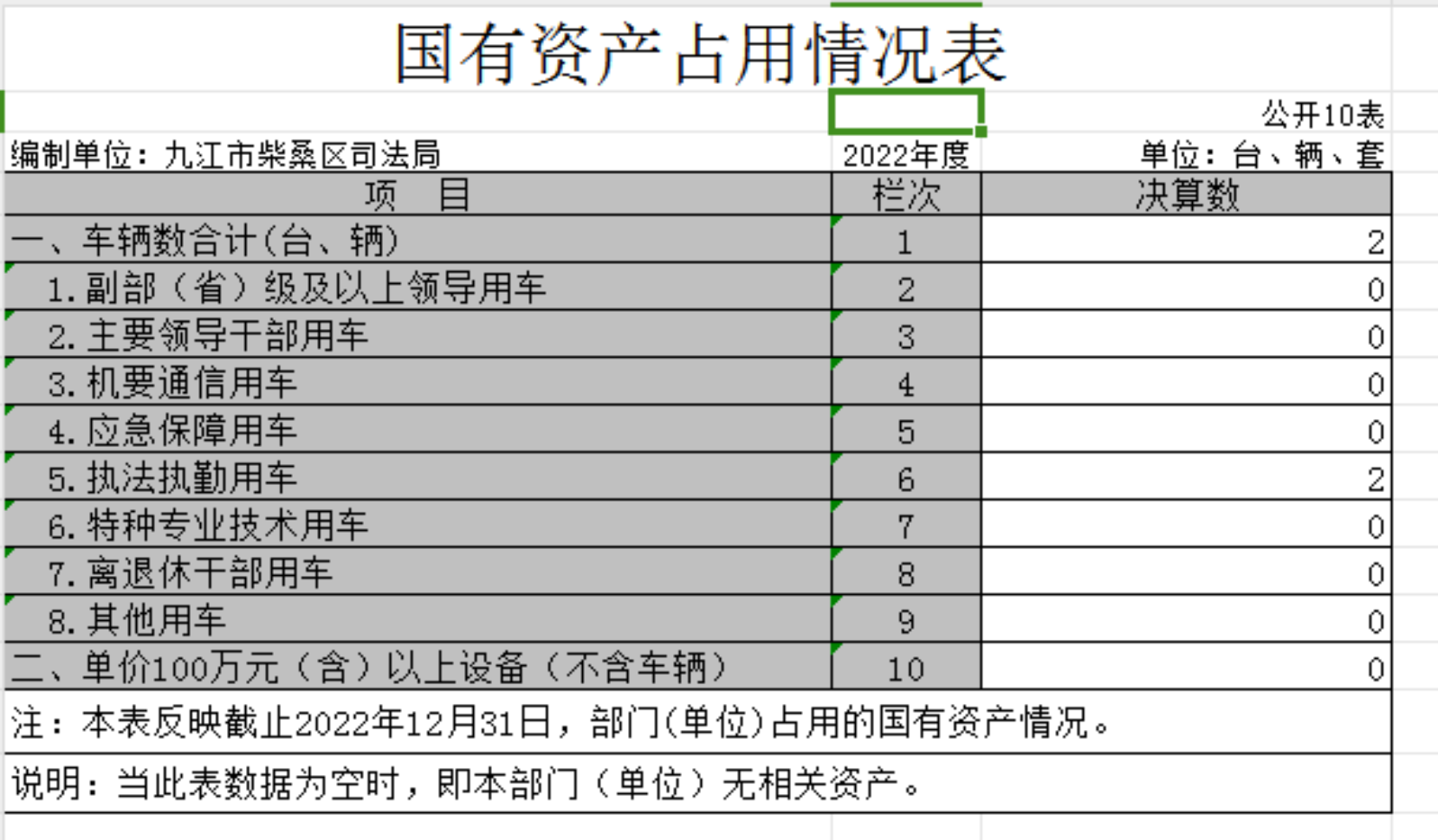 截至2022年12月31日,本部门国有资产占用情况见公开10表《国有资产占用情况表》。截至2022年12月31日,本单位共有车辆2 辆,其中:执法执勤用车2辆,其它用车为0辆。