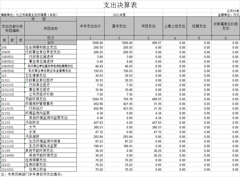 本单位2021年度收入总计1506.06万元,其中年初结转和结余0万元,较2020年减少286.4万元,下降100 %;本年收入合计1506.06万元,较2020年减少1401.75万元,下降48.21%,主要原因是:水体污染防治、其他节能环保支出投入减少。
