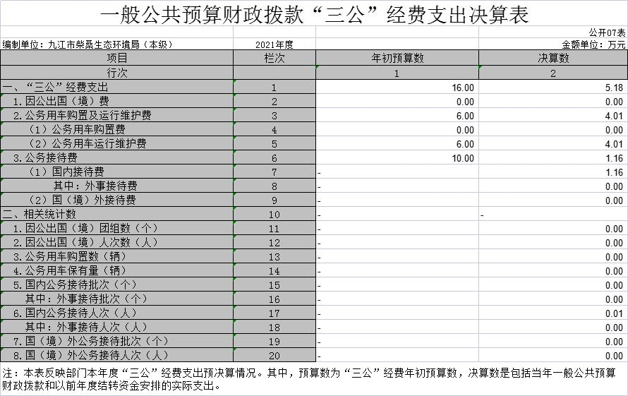 (五)“三公”经费支出:指用一般公共预算财政拨款安排的因公出国(境)费、公务用车购置及运行维护费和公务接待费。其中,因公出国(境)费反映单位公务出国(境)的国际旅费、国外城市间交通费、住宿费、伙食费、培训费、公杂费等支出;公务用车购置及运行维护费反映单位公务用车车辆购置支出(含车辆购置税、牌照费),按规定保留的公务用车燃料费、维修费、过桥过路费、保险费、安全奖励费用等支出;公务接待费反映单位按规定开支的各类公务接待(含外宾接待)支出。