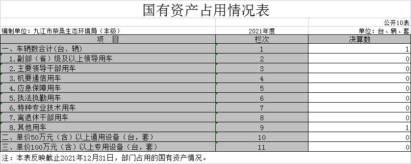 截止2021年12月31日,共有车辆1辆,单价50万元(含)以上通用设备 0台(套), 单价100万元(含)以上专用设备 0台(套)。本单位国有资产占用情况见公开10表《国有资产占用情况表》。