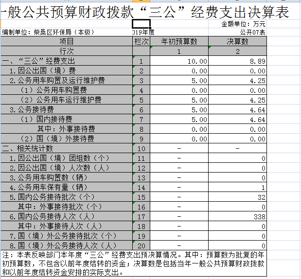 (三)公务用车购置及运行维护费支出4.25万元,其中公务用车购置年初预算数为0万元,决算数为0万元,完成年初预算的0%,决算数较2018年增加0万元,增长0%。决算数较年初预算数增加的主要原因是:未购置公务用车;公务用车运行维护费支出年初预算数为5万元,决算数为4.25万元,完成年初预算的85%,决算数较2018年增加0.85万元,增长25%。决算数较年初预算数增加的主要原因是:环保专项检查督查增加。