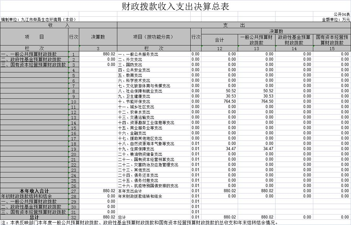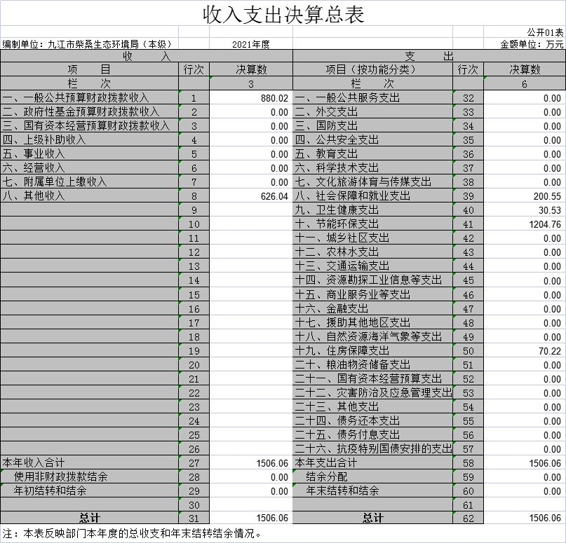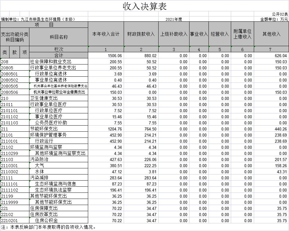 本单位2021年度收入总计1506.06万元,其中年初结转和结余0万元,较2020年减少286.4万元,下降100 %;本年收入合计1506.06万元,较2020年减少1401.75万元,下降48.21%,主要原因是:水体污染防治、其他节能环保支出投入减少。