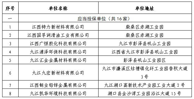 根据《中华人民共和国环境保护法》《中华人民共和国固体废物污染环境防治法》和《江西省推进环境污染责任保险工作实施方案》相关要求,经江西省生态环境厅审核通过,我市共有16家单位应当投保环境污染责任保险,60家单位建议投保环境污染责任保险,具体名单如下: