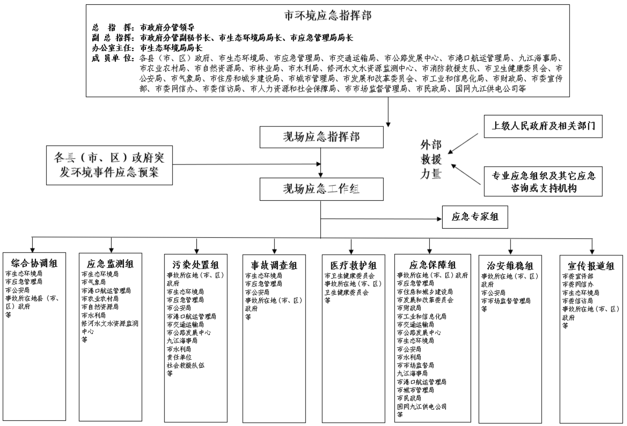 九江市突发环境事件应急组织体系主要由市突发环境事件应急指挥部(以下简称市环境应急指挥部)及其下设的办公室、现场应急指挥部、现场应急工作组、各县(市、区)人民政府突发环境事件应急组织体系及外部救援力量等组成。