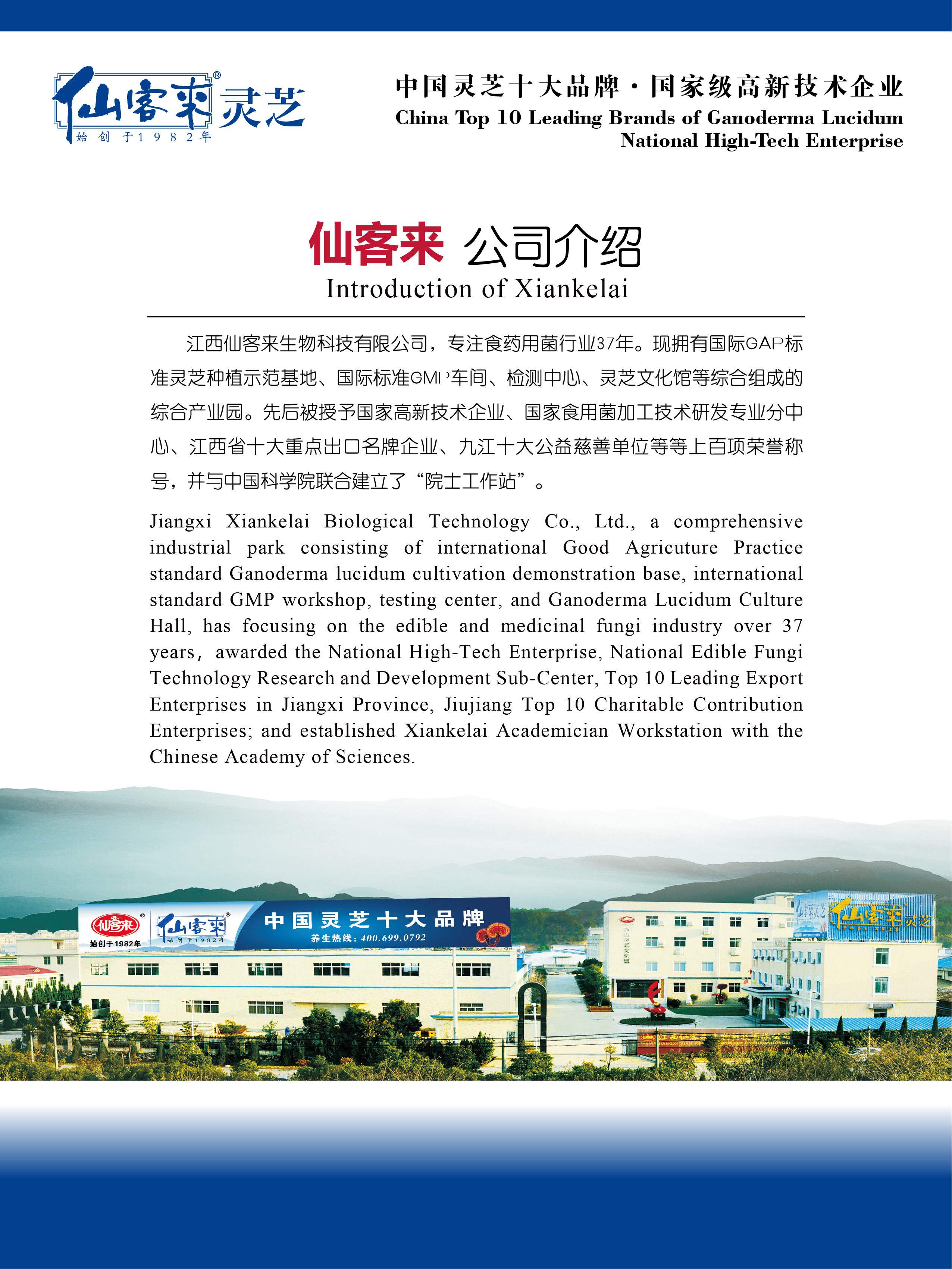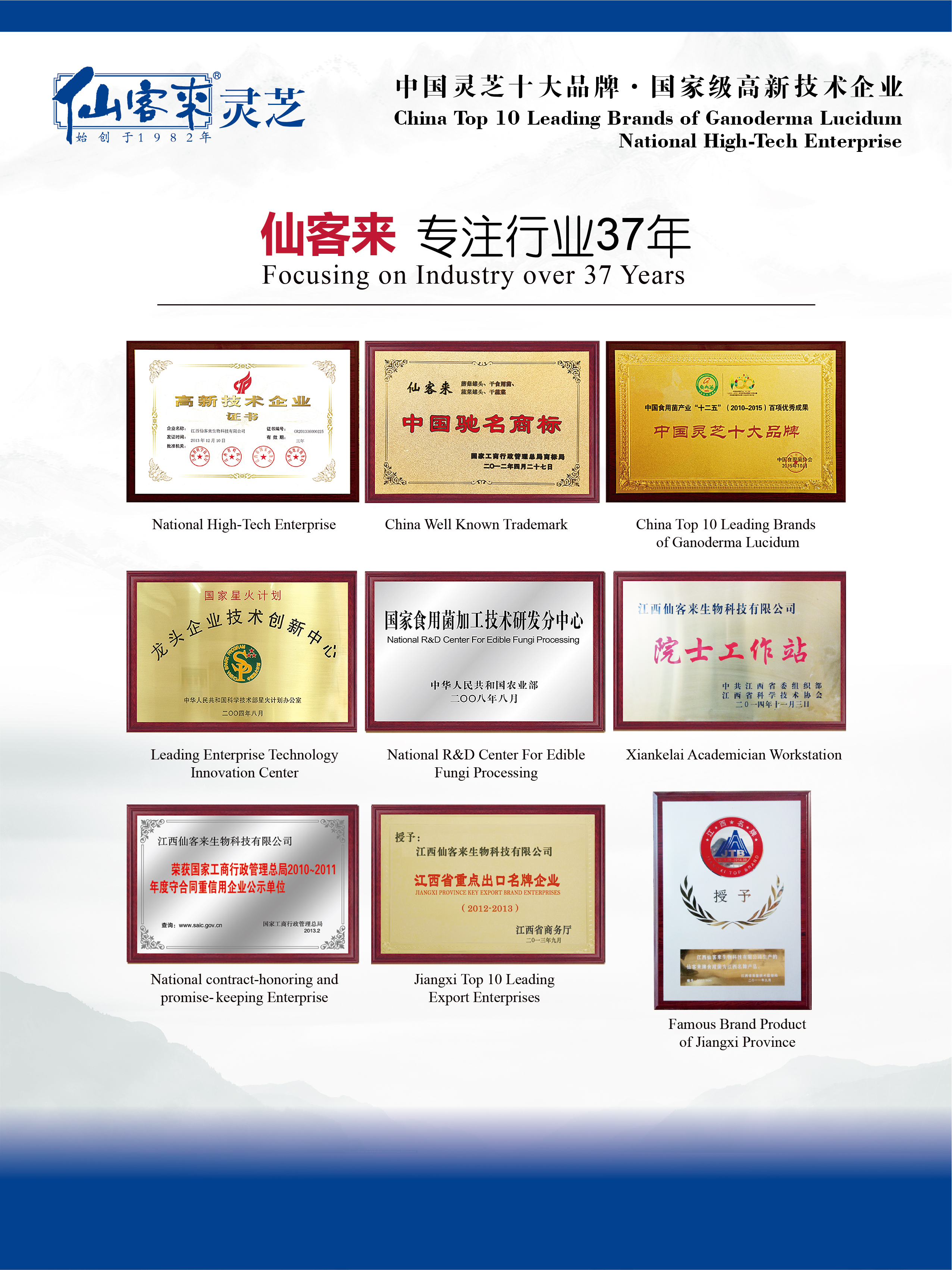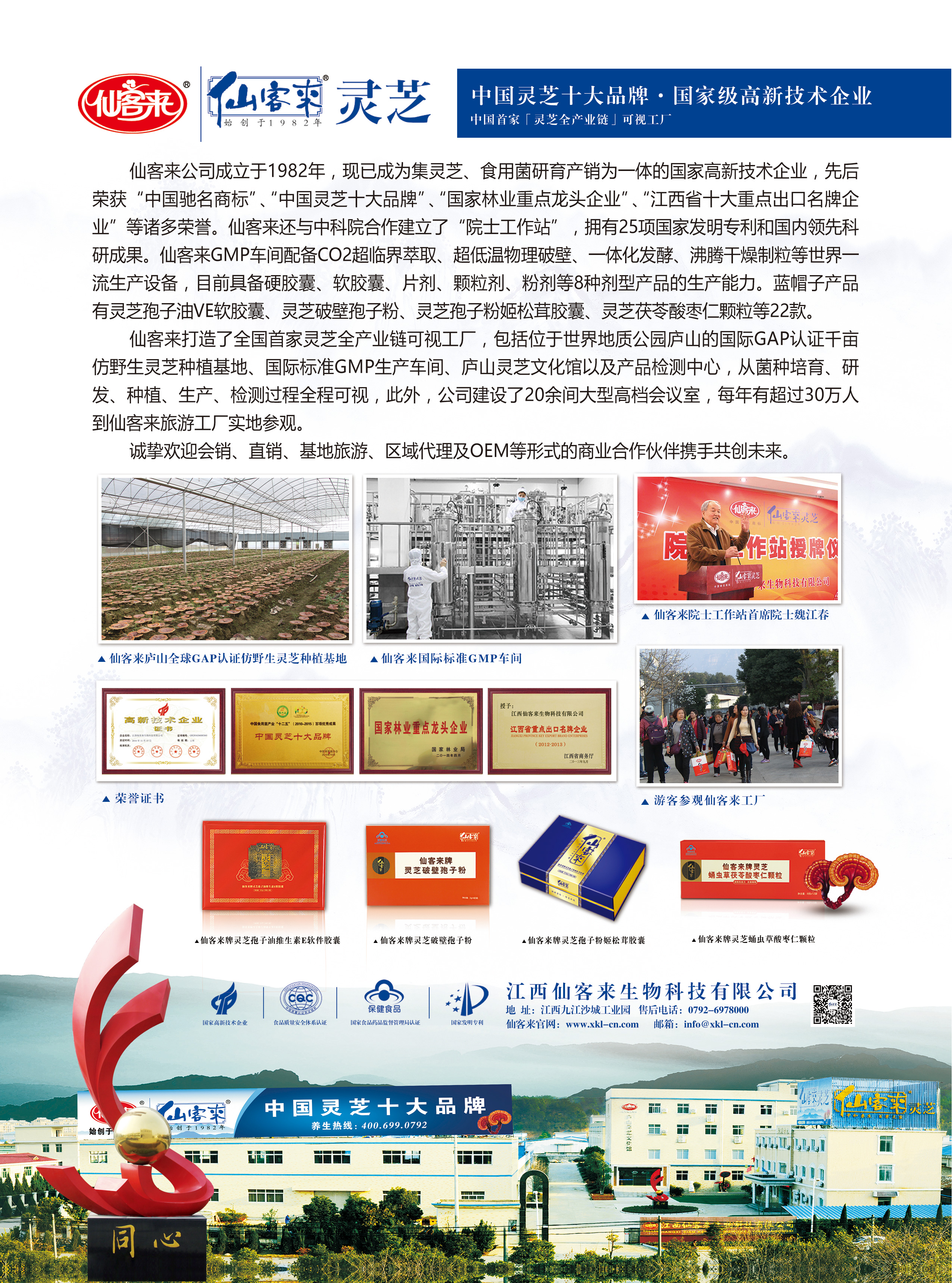 江西仙客来生物科技有限公司是专注行业37年,专业从事灵芝、食(药)用菌研育产销的“国家高新技术企业”、“国家林业重点龙头企业”、“全国民族特需商品定点生产企业”、“全国守合同重信用单位”、“中国灵芝十大品牌”企业、“江西省十大重点出口名牌企业”、“九江十大公益慈善单位”,是国家农业综合开发重点项目实施单位。“仙客来”商标是国家工商总局认定的“中国驰名商标”。