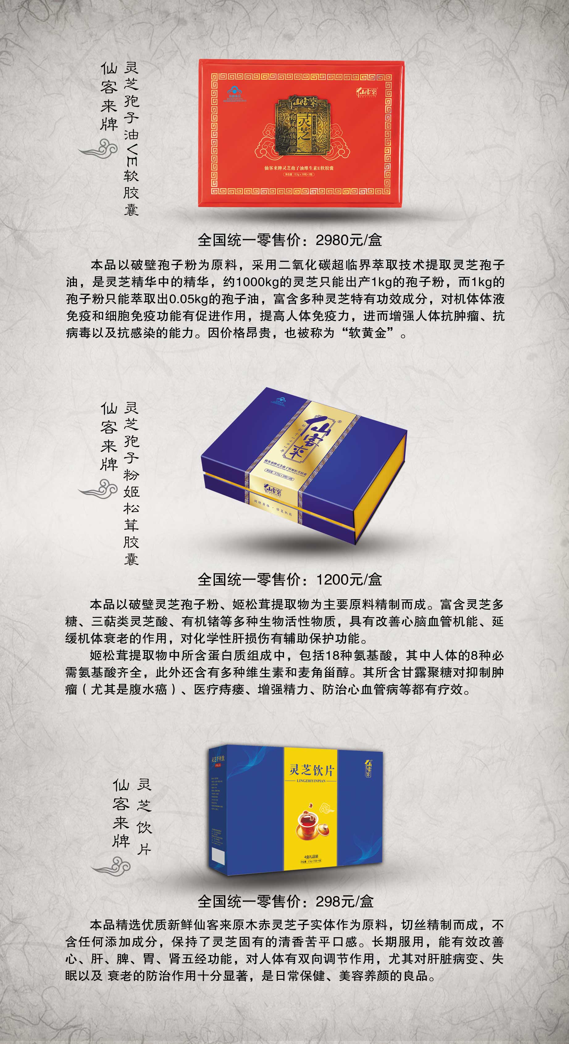 公司自主研发的灵芝、食用菌系列产品有100多种产品,被国家权威机构认定为有机食品、清真食品、森林食品、保健食品。仅灵芝产品有硬胶囊剂、软胶囊剂、片剂、口服液剂、茶剂、粉剂、颗粒剂、中药饮片8个剂型22个健字号,居全国第一。产品畅销上海、北京等20多个省市,并出口日本、欧美等海外地区,还被人民大会堂和钓鱼台国宾馆国宴选用。仙客来灵芝系列产品被海内外1000余位政商领袖选定为日常保健功用食品。