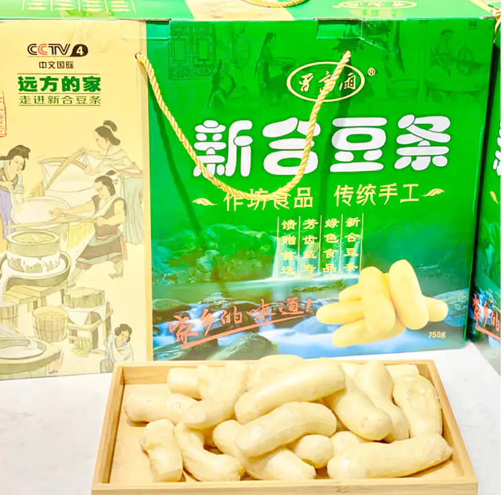 柴桑区新合镇盛产豆条,以体形圆满、绵软如絮、清香可口、味鲜独特、富含营养而远近闻名。新合豆条色彩亮泽,成型饱满,口感柔软,没有渣。每到过年,周边不少人慕名而来,跑大老远到柴桑区新合镇采购豆条过年。逢年过节,妈妈总是买些豆条回来让我们姊妹几个开开荤,还没等豆条下窝,我老是偷偷拿上几根生吃,那味清酥爽口让人尝过之后余味无穷。等到那夹杂豆条和肉味浓香扑入鼻中时,我总是等不及,让妈妈先给我盛上一小碗尝,每每喝着那热气腾腾的豆条汤,那鲜味儿美得我眼睛都眯成一条缝,可以这样说豆条是我童年心目中最美的一道菜。