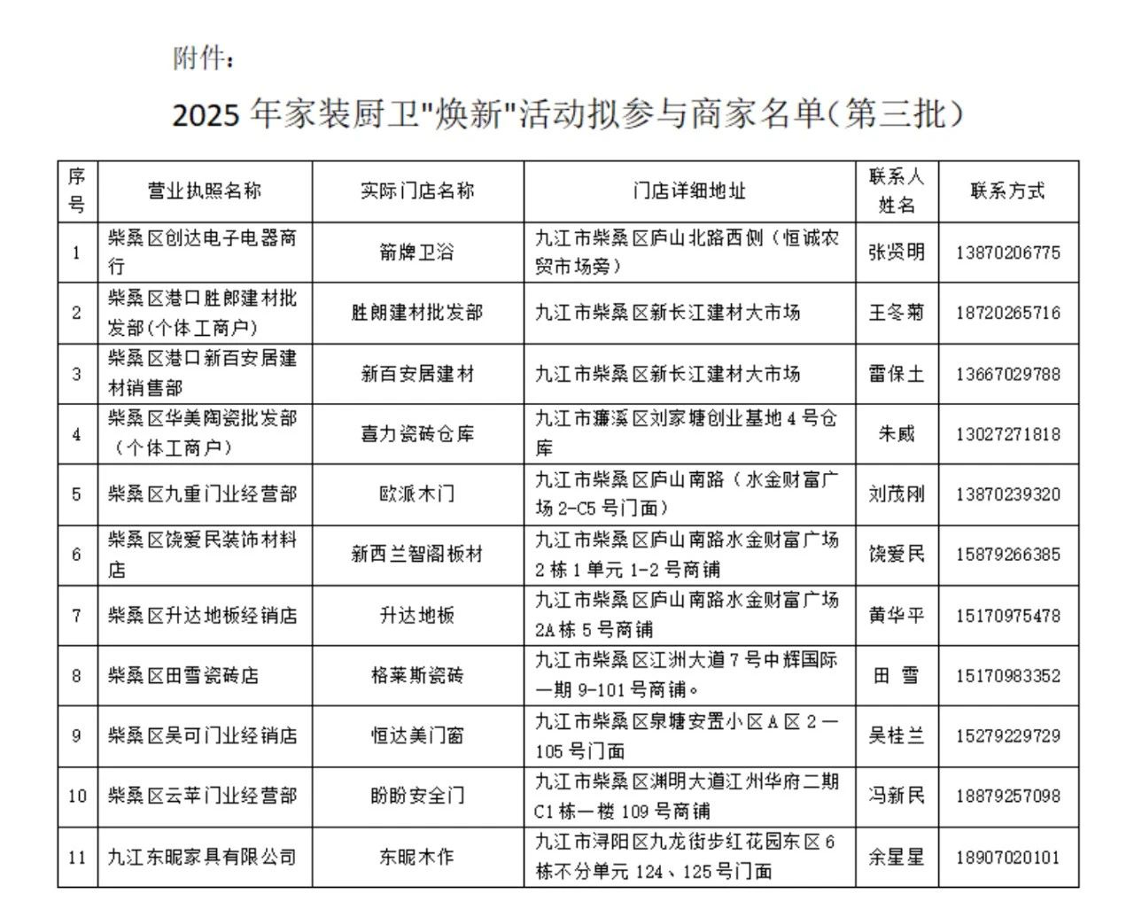 柴桑区商务局关于2025年家装厨卫“焕新”活动参与商家的公示(第三批)