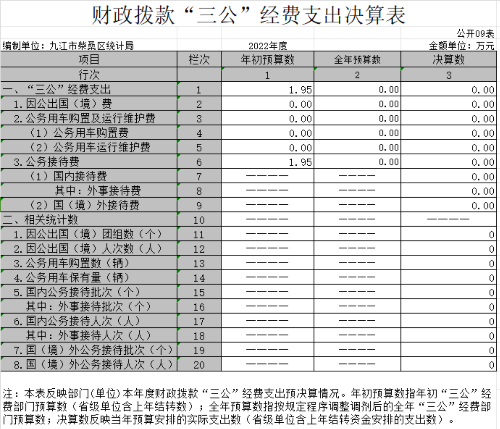 本部门2022年度财政拨款“三公”经费支出全年预算数为1.95万元,决算数为0万元,完成全年预算的0%,决算数较2021年减少1.28万元,下降0 %,其中: