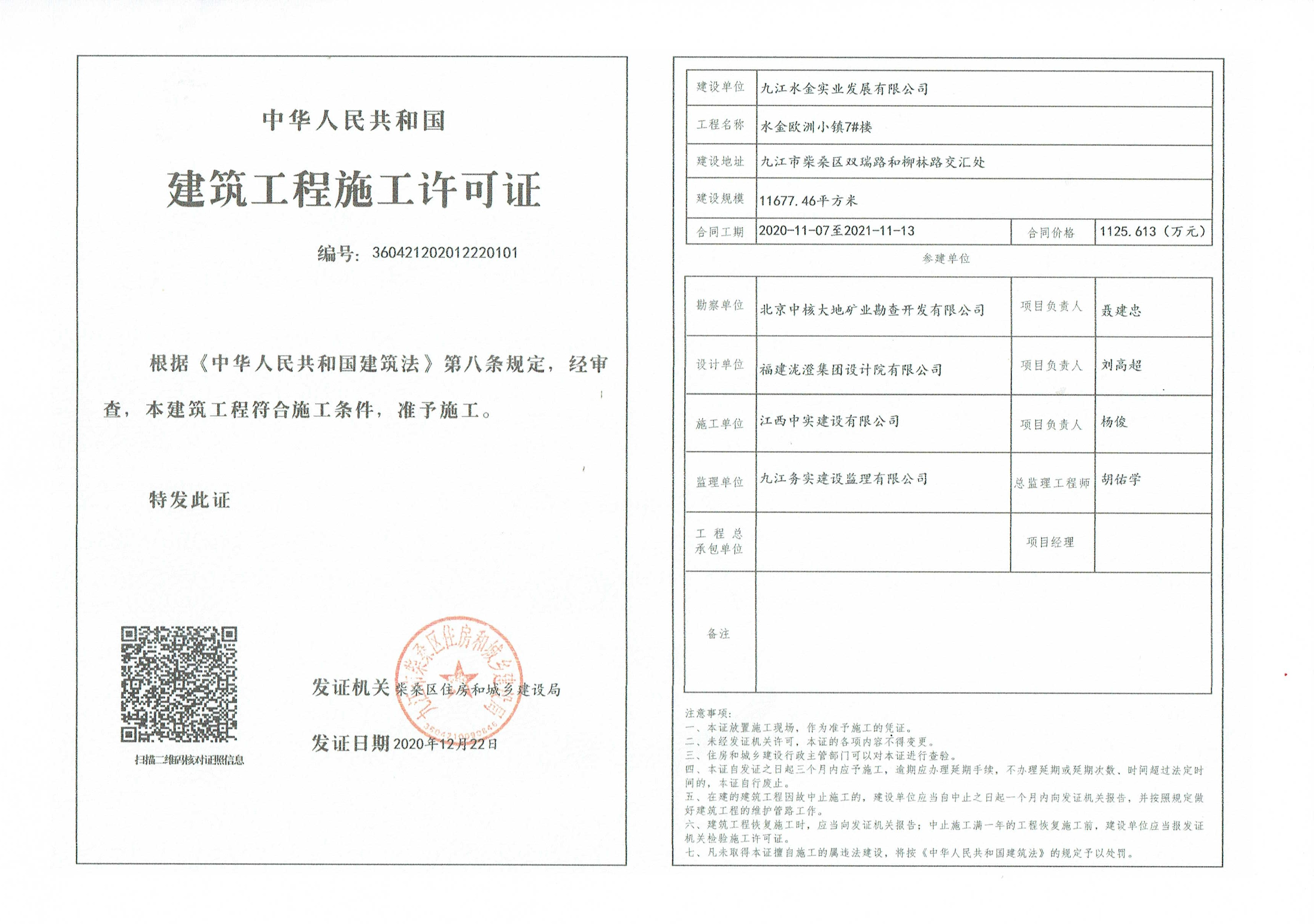 核发水金欧洲小镇7#楼建筑工程施工许可证