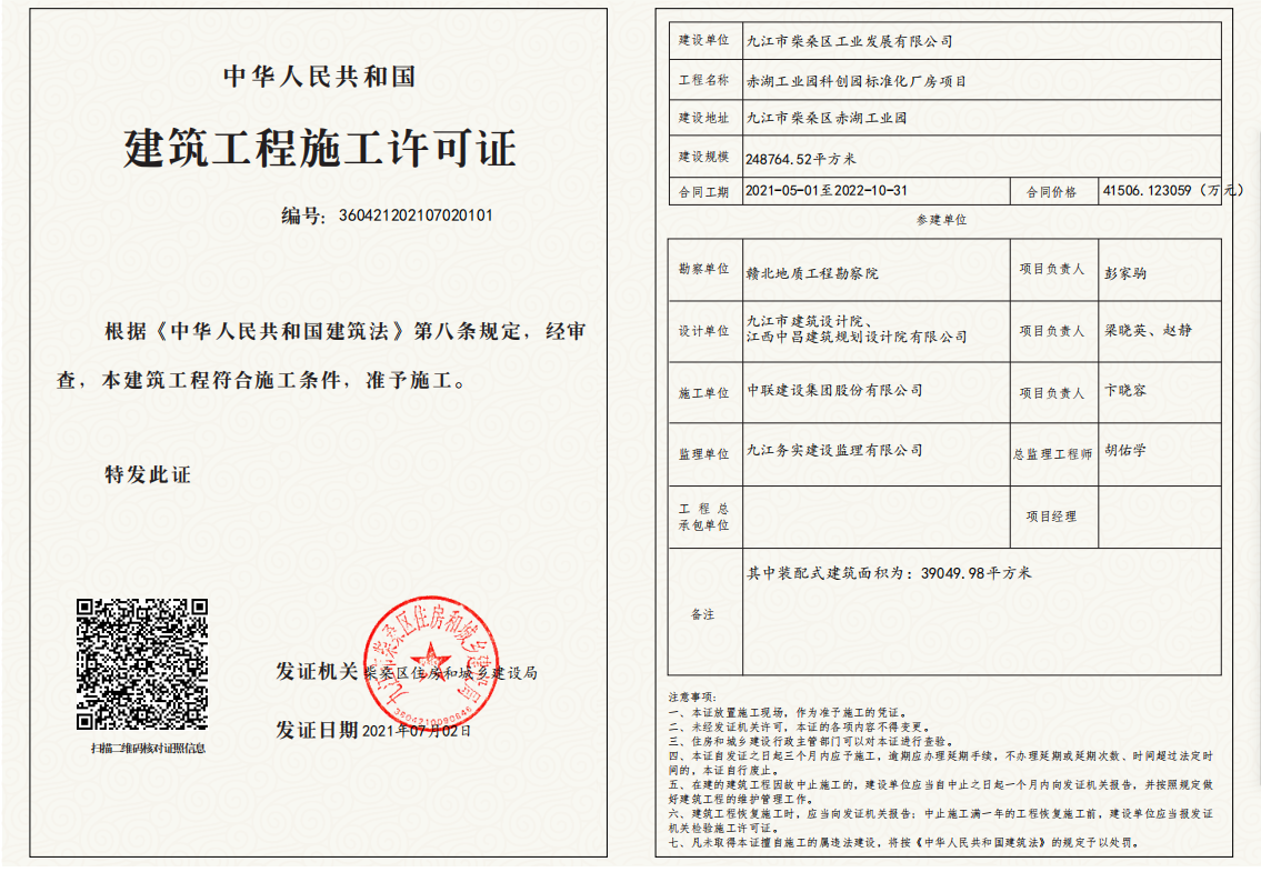 核发赤湖工业园科创园标准化厂房项目建筑工程施工许可证