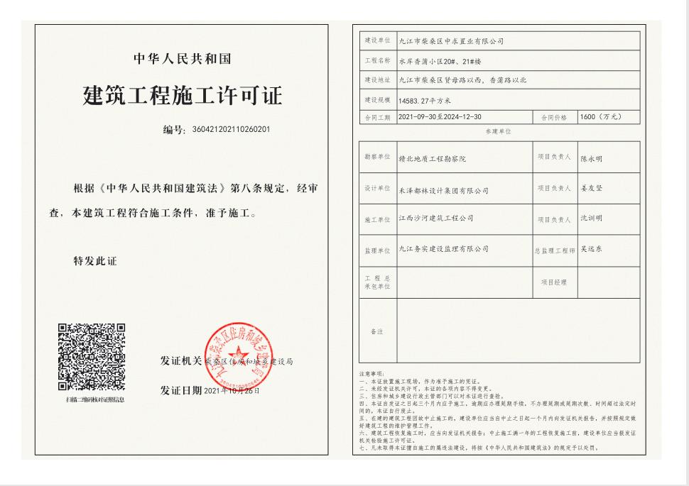 核发水岸香蒲小区20#、21#楼建筑工程施工许可证