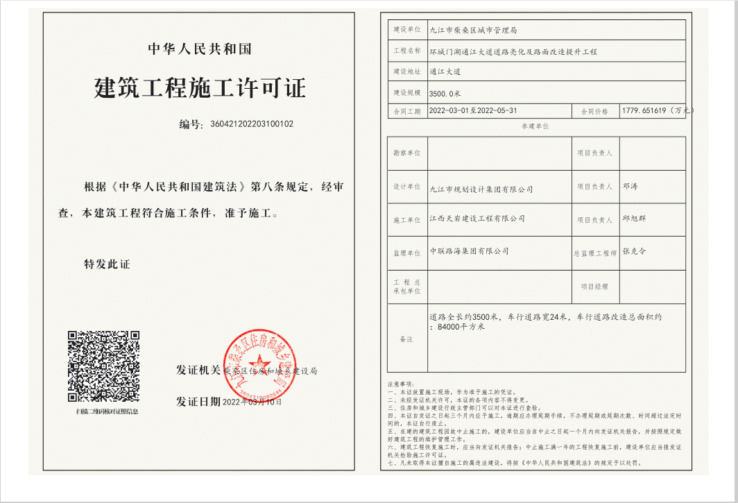核发环城门湖通江大道道路亮化及路面改造提升工程建筑工程施工许可证