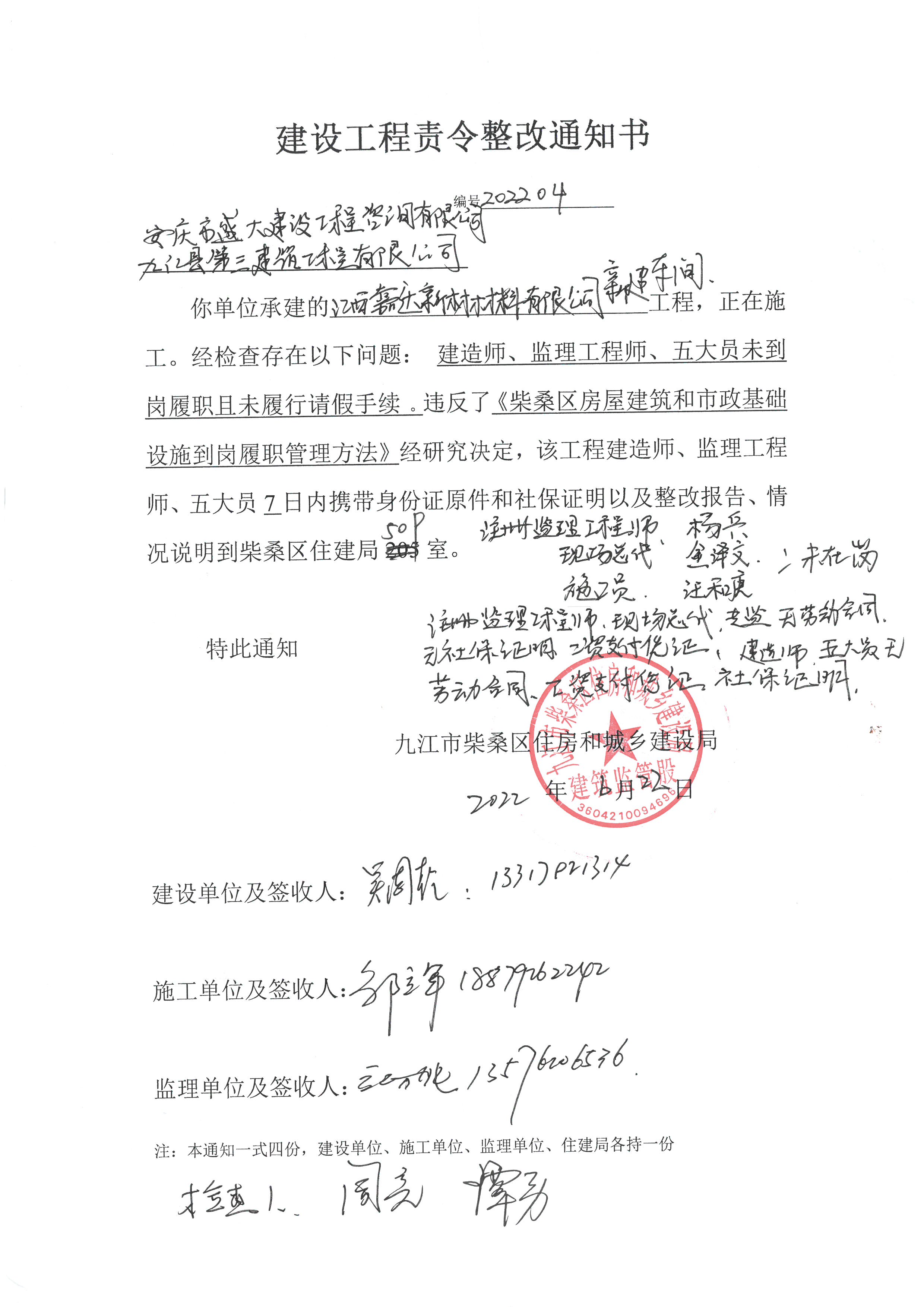 江西嘉达新材料有限公司新建车间工程建设工程责令整改通知书