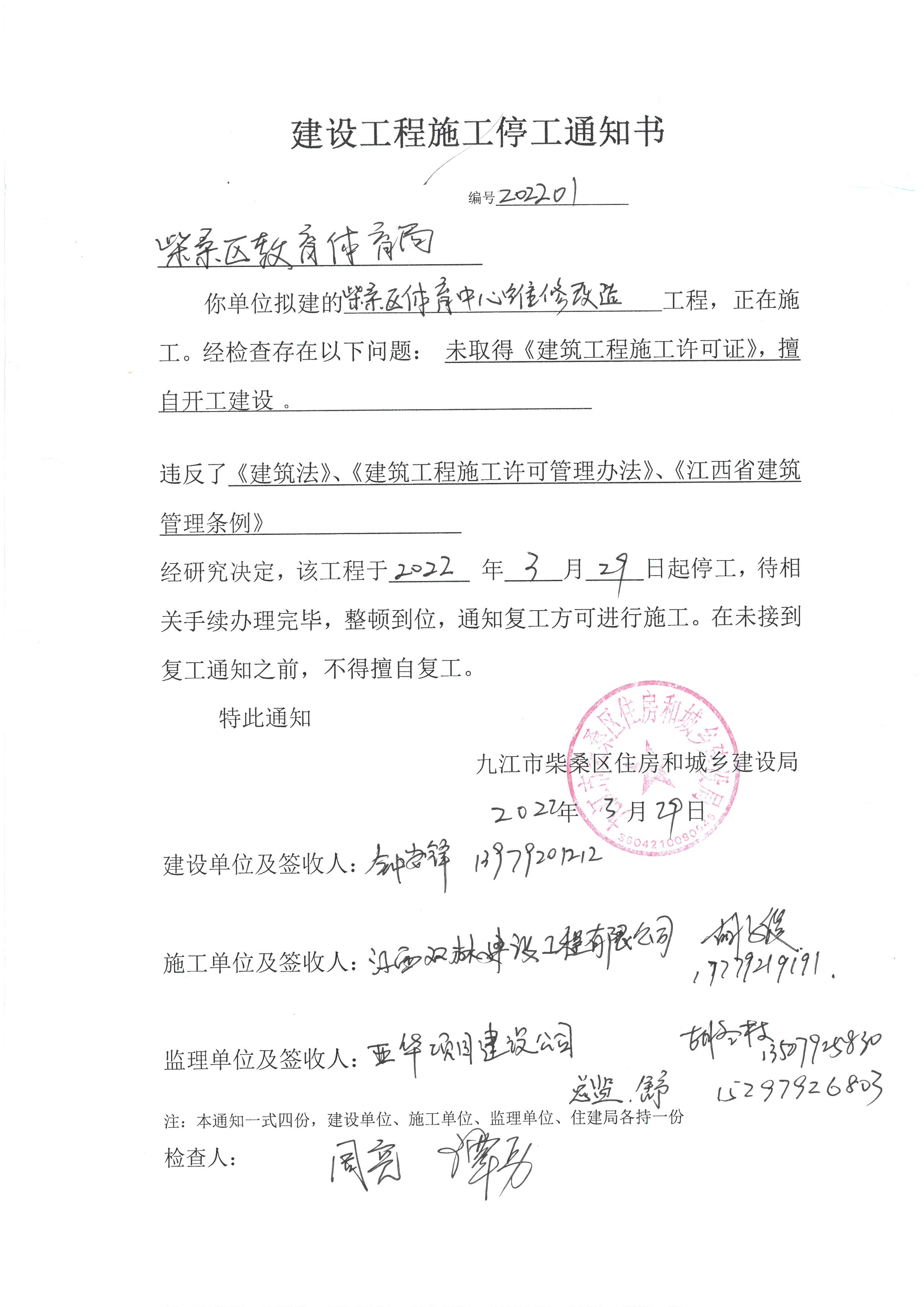 柴桑区体育中心维修改造工程建设工程施工停工通知书