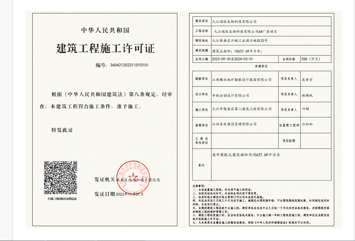 核发九江瑞旺生物科技有限公司6#厂房项目建筑工程施工许可证