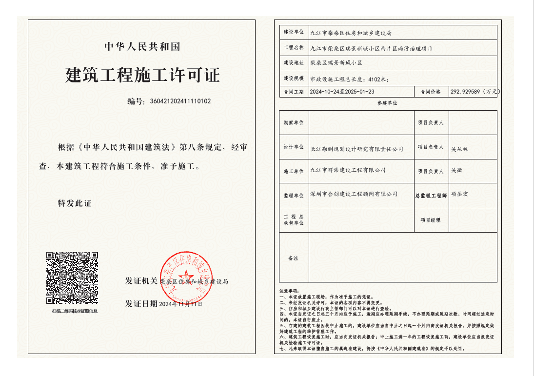 核发九江市柴桑区瑞景新城小区西片区雨污治理项目建筑工程施工许可证