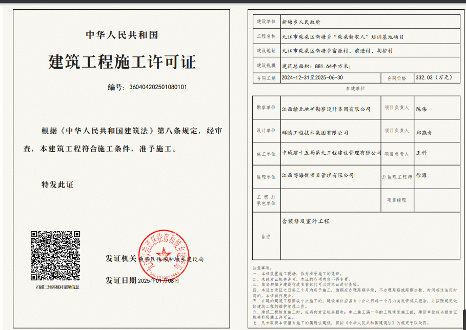 核发九江市柴桑区新塘乡“柴桑新农人”培训基地项目建筑工程施工许可证