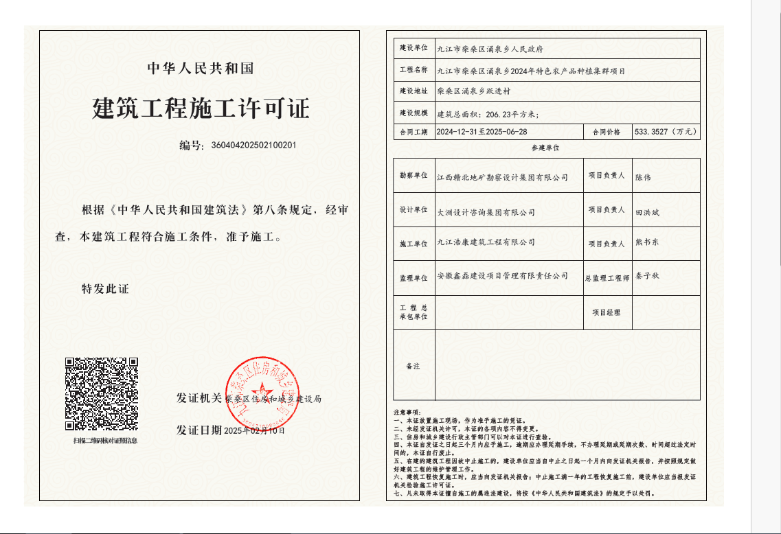 核发九江市柴桑区涌泉乡2024年特色农产品种植集群项目建筑工程施工许可证
