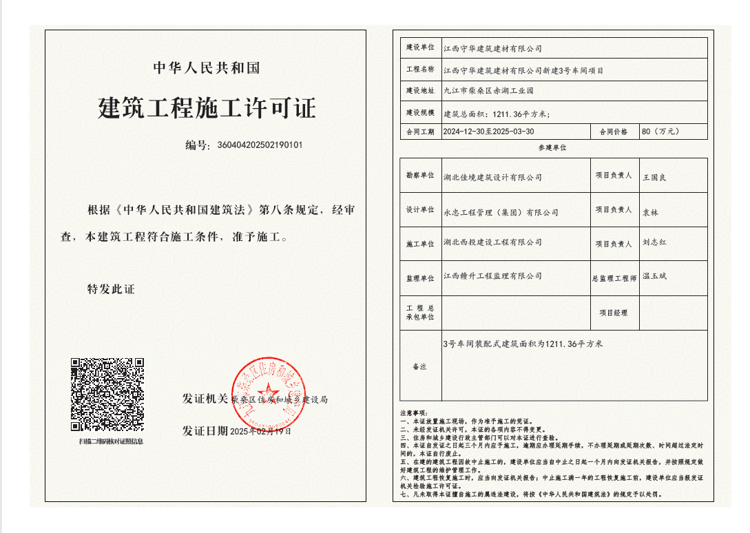 核发江西守华建筑建材有限公司新建3号车间项目建筑工程施工许可证