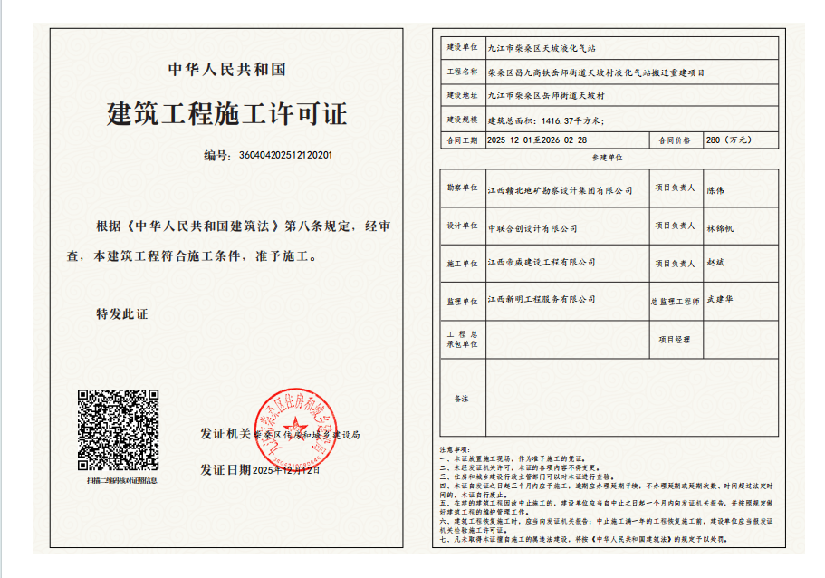 核发柴桑区昌九高铁岳师街道天坡村液化气站搬迁重建项目工程施工许可证