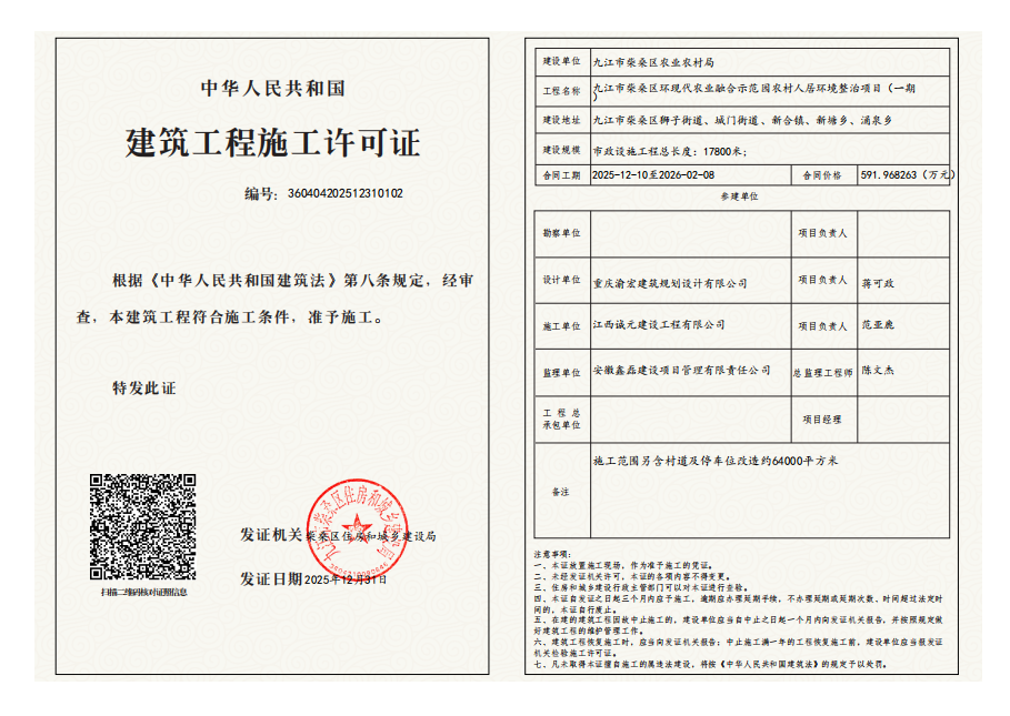 核发九江市柴桑区环现代农业融合示范园农村人居环境整治项目施工许可证