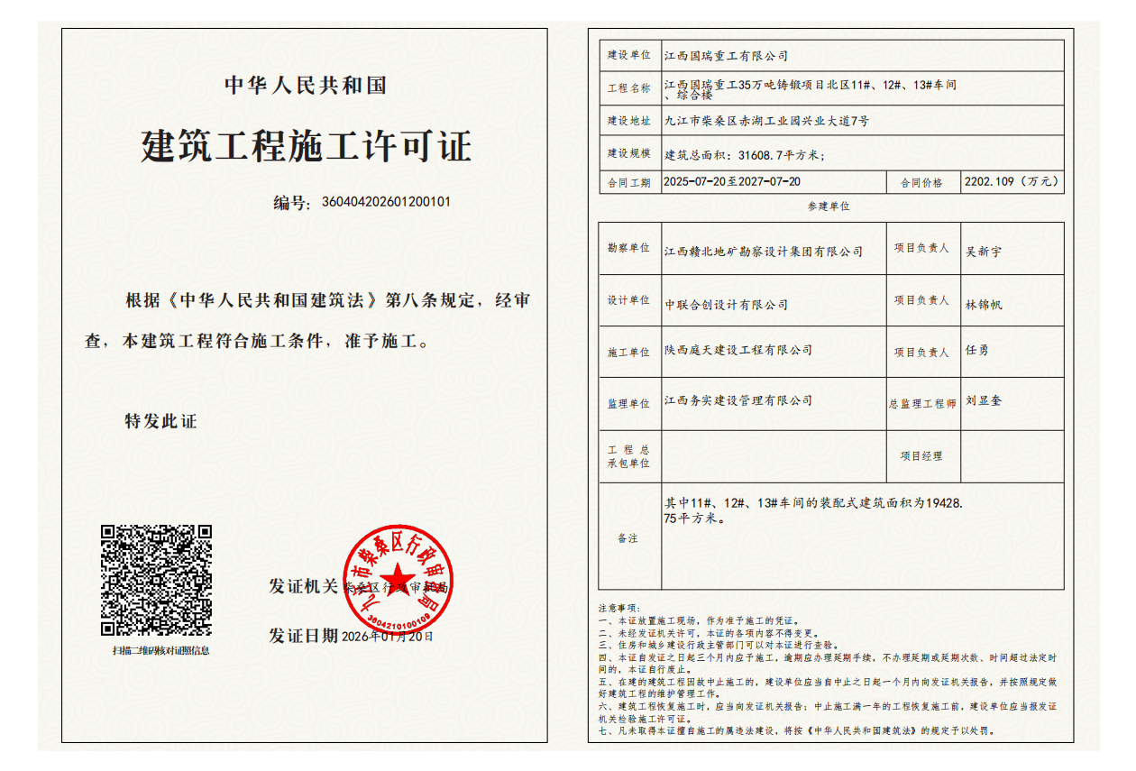 核发江西国瑞重工35万吨铸锻项目施工许可证