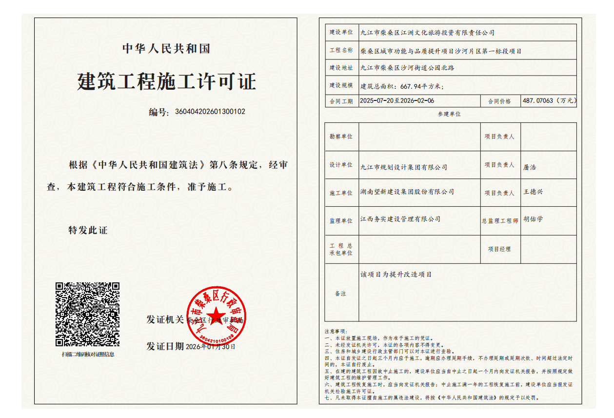 核发柴桑区城市功能与品质提升项目沙河片区第一标段项目施工许可证