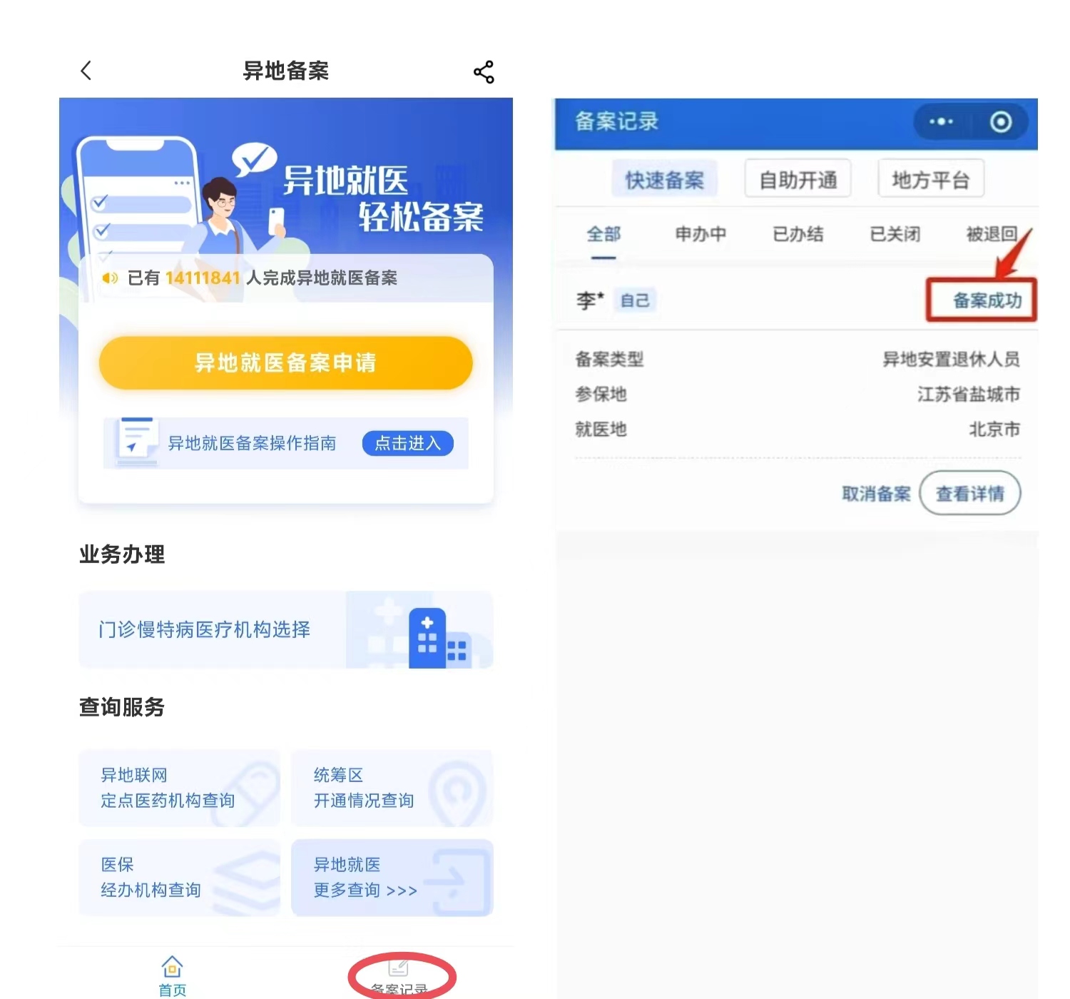 点击首页【备案记录】按钮,进入异地就医备案记录页面,实时查看备案进度。