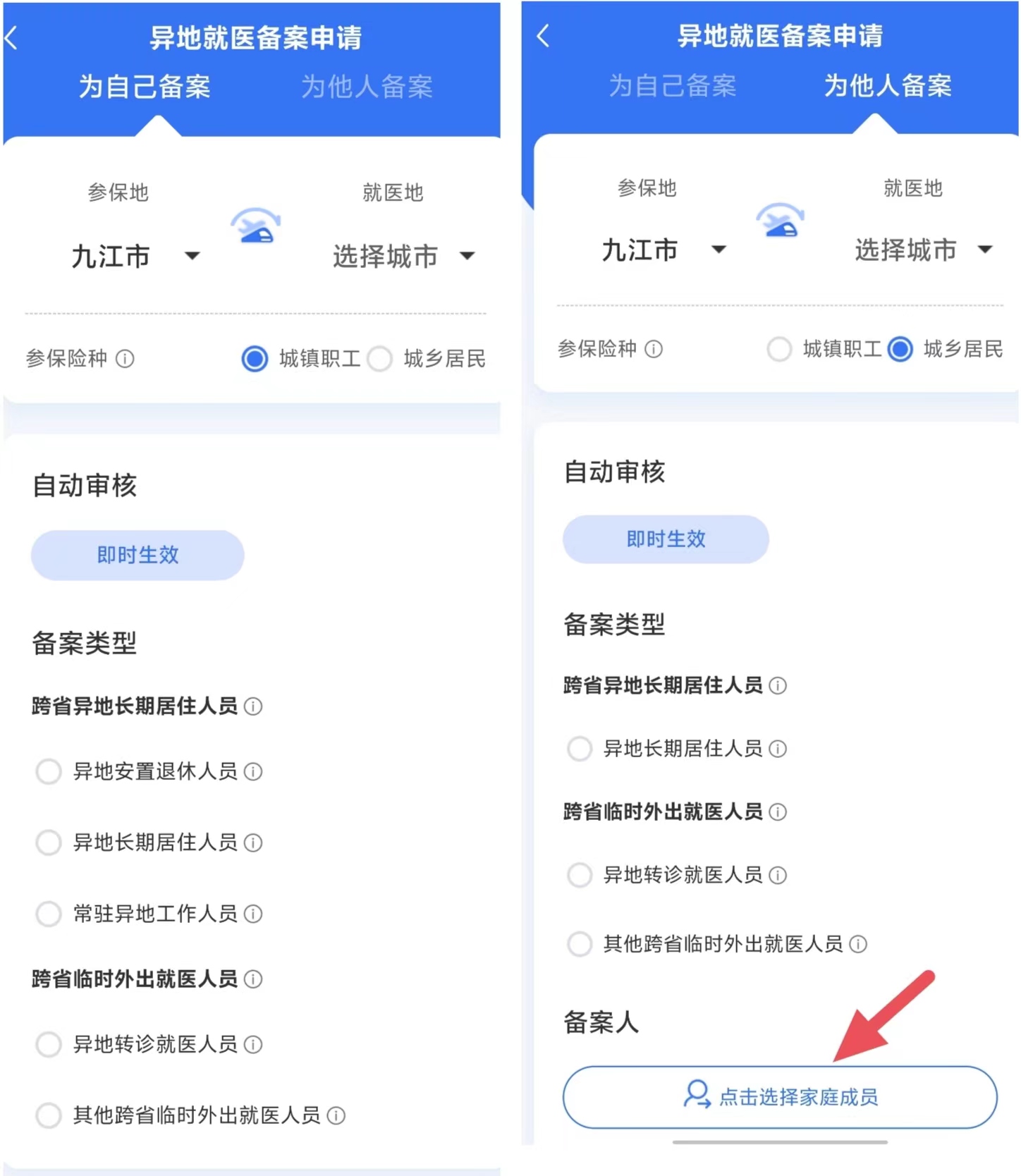 进入异地就医备案申请页面,参保地为系统默认,参保人可以根据实际情况进行调整,同时做好就医地、参保险种、备案类型的选择,可点击各项备案类型后的“感叹号”查看提示内容。