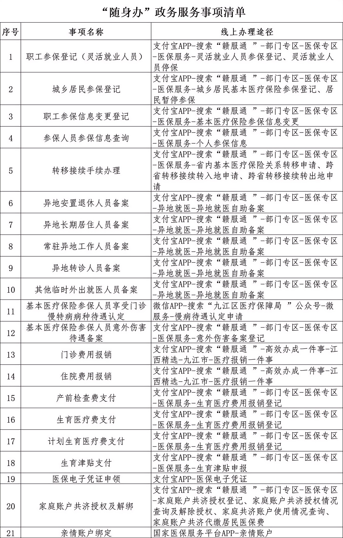 “随身办”政务服务事项线上办理渠道清单