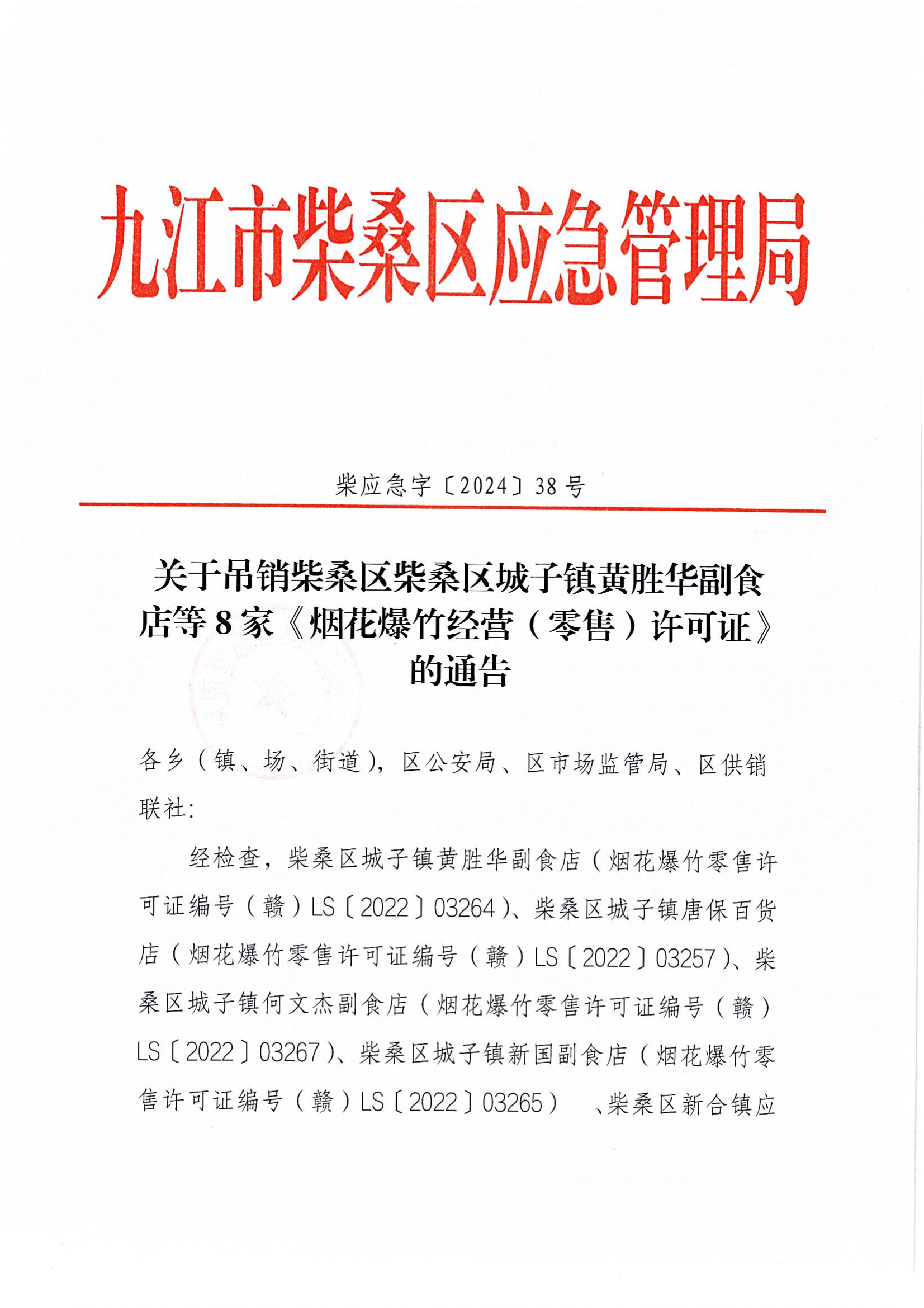关于吊销柴桑区柴桑区城子镇黄胜华副食店等8家《烟花爆竹经营(零售)许可证》的通告