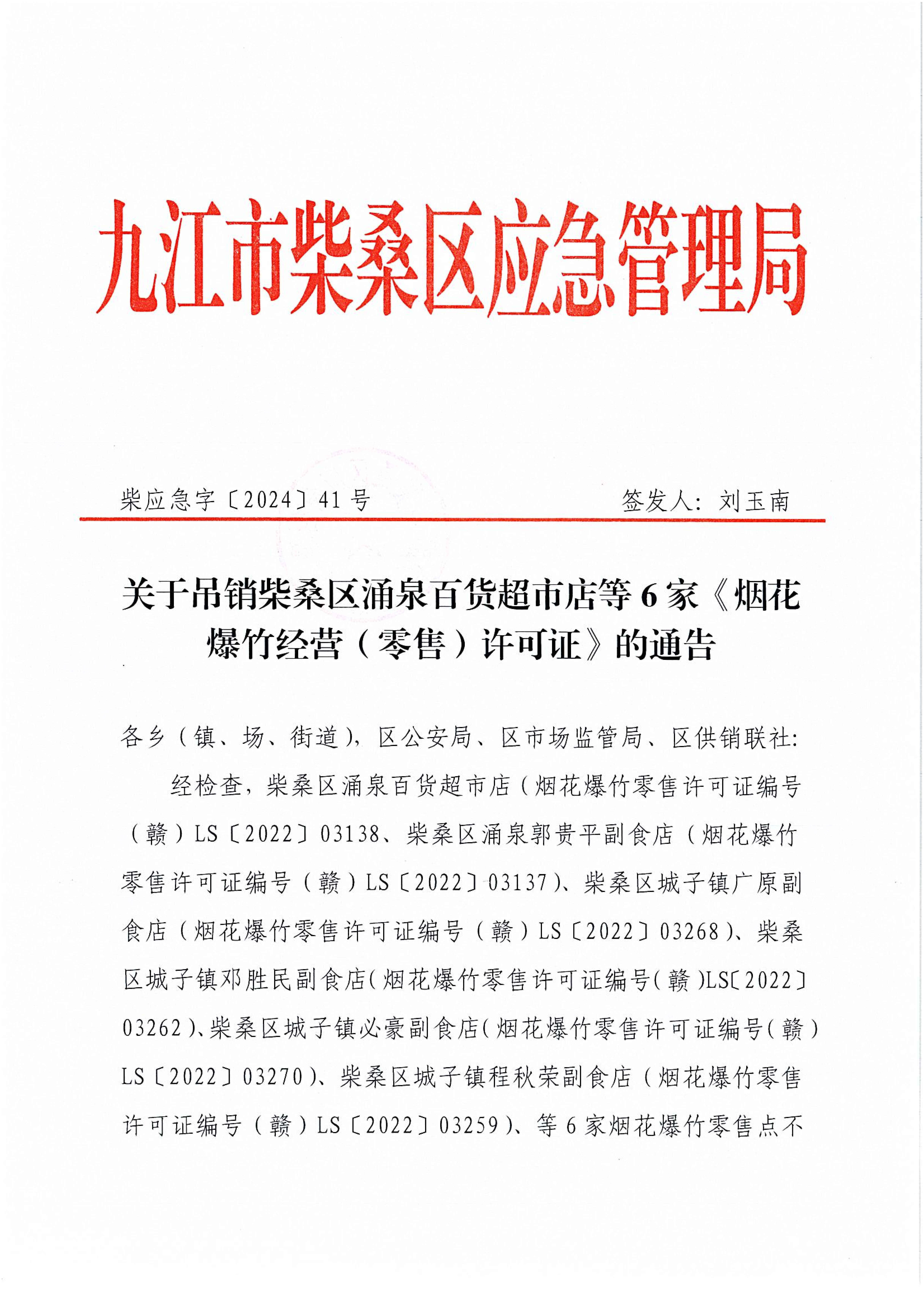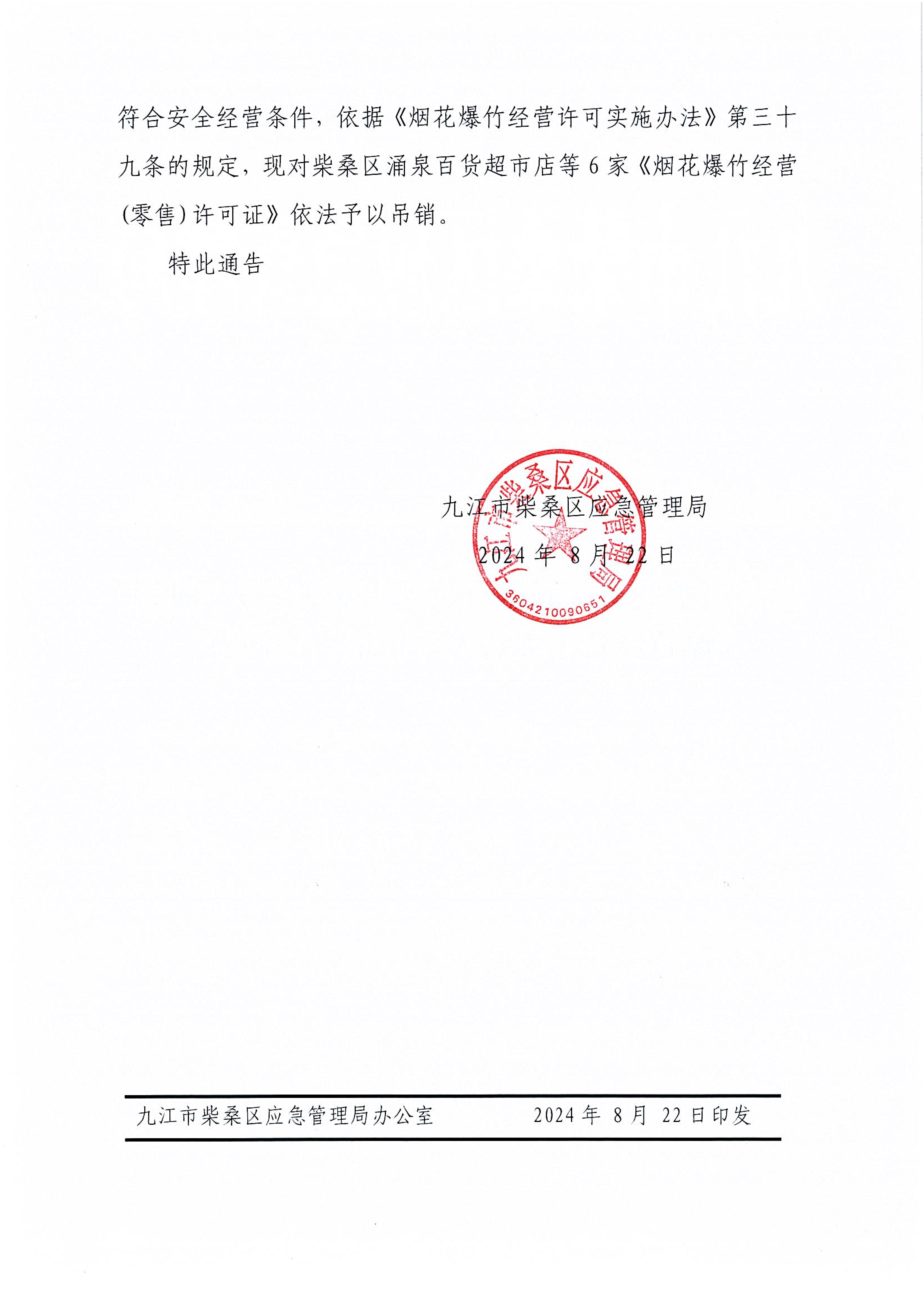 关于吊销柴桑区涌泉百货超市店等6家《烟花爆竹经营(零售)许可证》的通告
