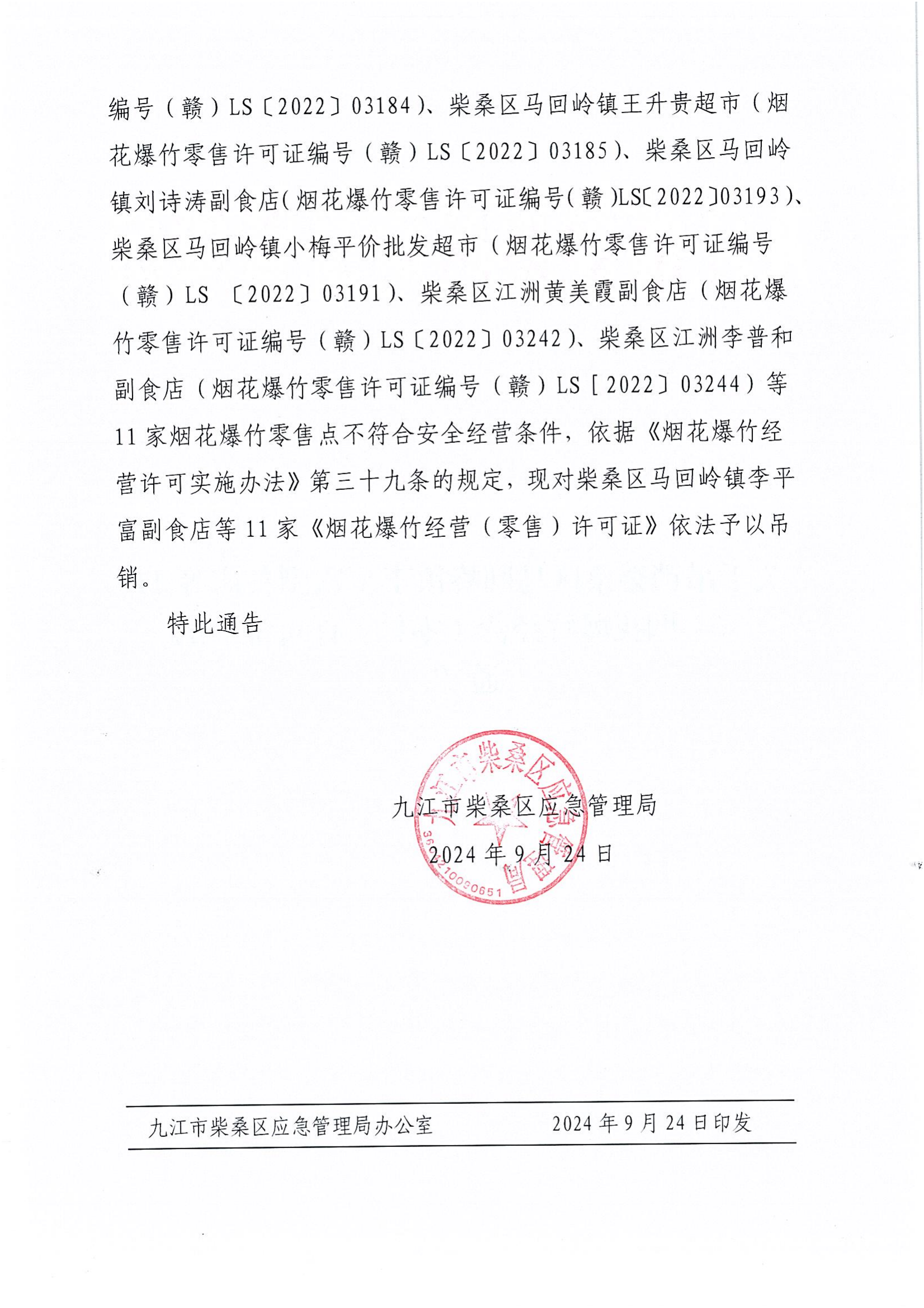 50关于吊销柴桑区马回岭镇李平富副食店等11家《烟花爆竹经营(零售)许可证》的通告_00
