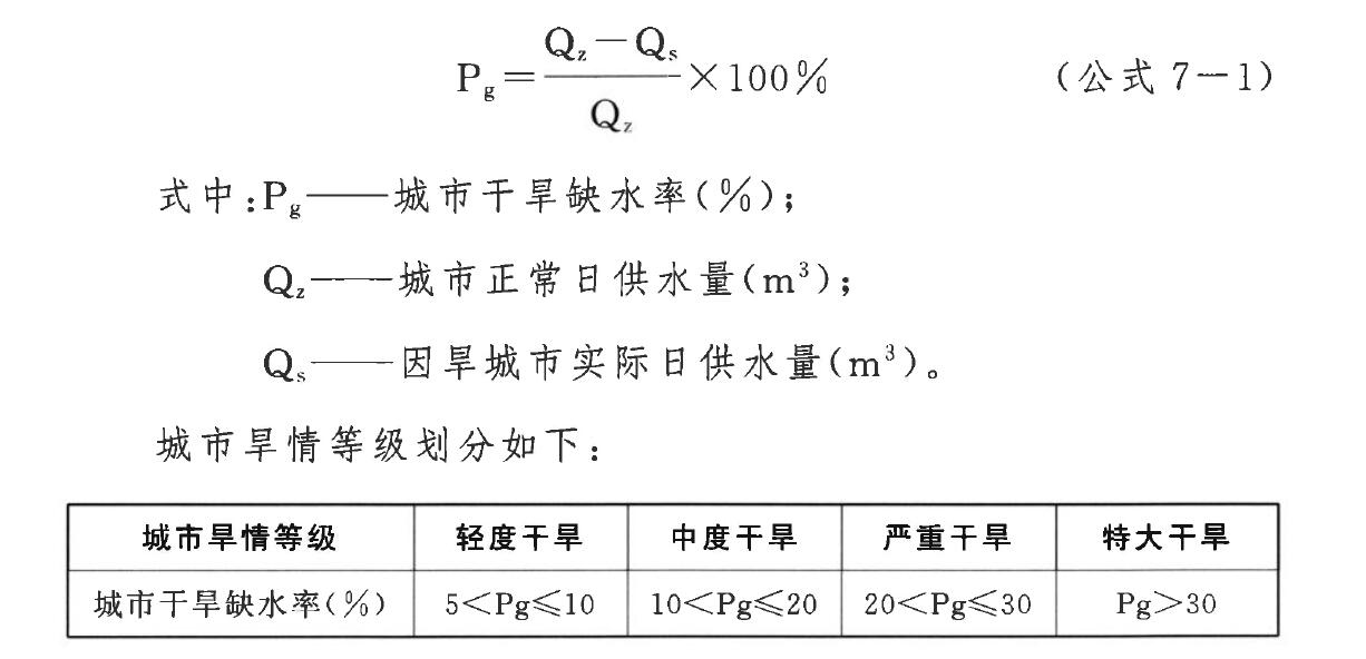 7.1.7 城市干旱缺水率:指因干旱导致城市供水不足,其日缺水量与正常日供水量的比值,以百分率表示。城市干旱缺水率应按公式7-1计算:7.1.8紧急防汛期:按照《中华人民共和国防洪法》规定,当江河、湖泊的水情接近保证水位或者安全流量,水库水位接近设计洪水位或者防洪工程设施发生重大险情,有关县级以上防汛抗旱指挥机构可以依法宣布进入紧急防汛期。当汛情趋缓时,有关防汛抗旱指挥机构应适时依法宣布结束紧急防汛期。