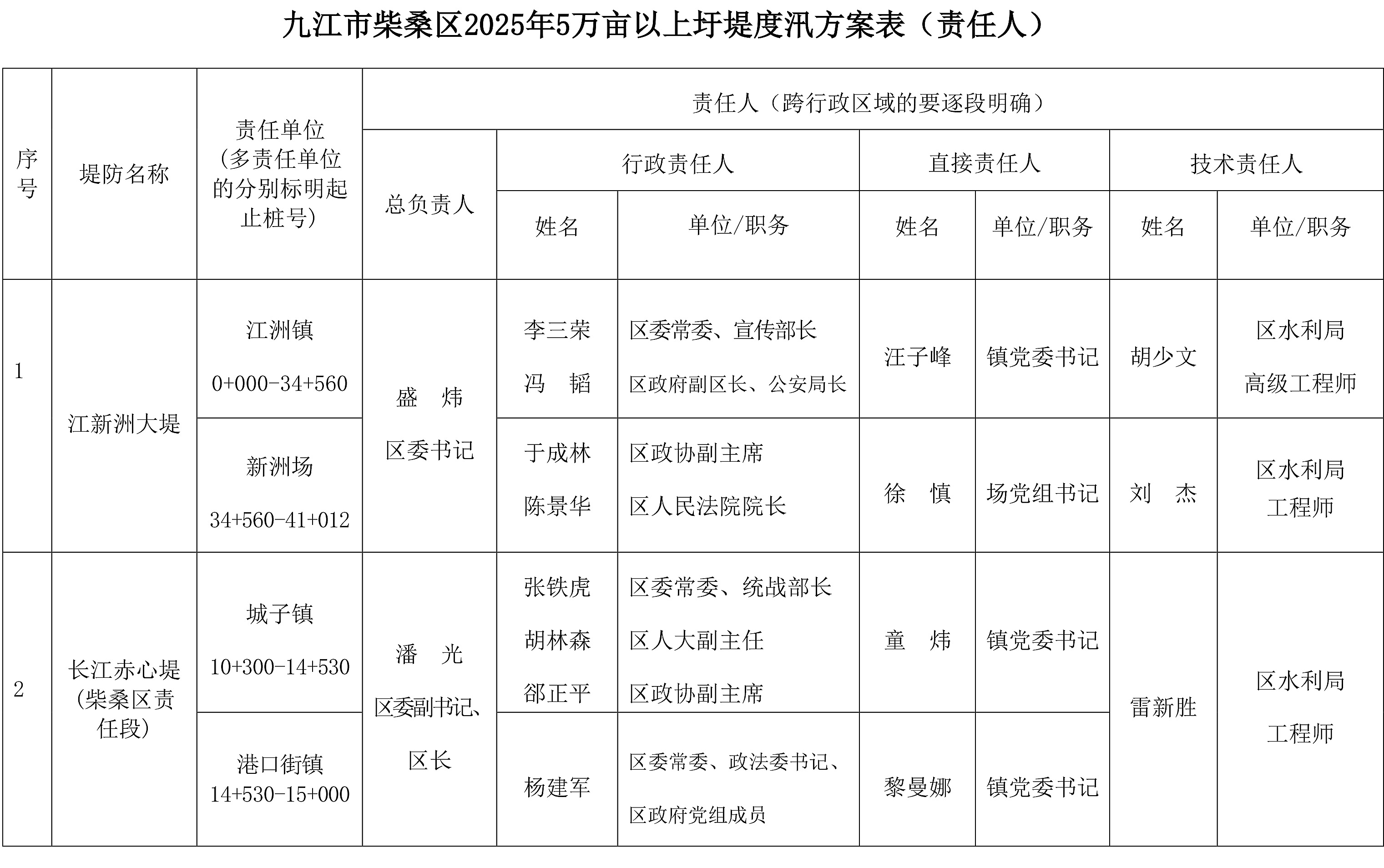 九江市柴桑区2025年5万亩以上圩堤度汛方案表(责任人)