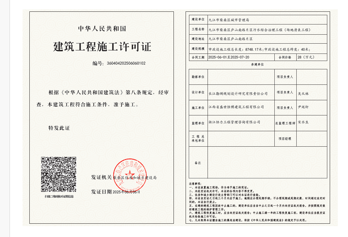 核发九江市柴桑区庐山南路片区污水综合治理工程(场地清表工程)施工许可证