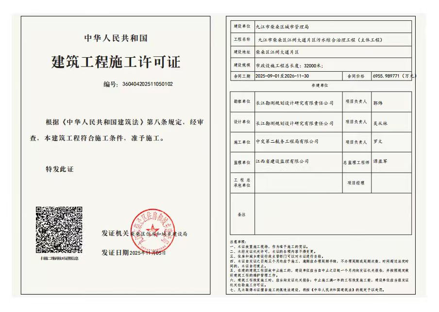 核发九江市柴桑区江州大道片区污水综合治理工程(主体工程)建筑工程施工许可证