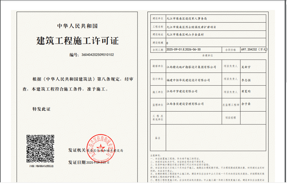 核发九江市柴桑区烈士陵园改建扩建项目施工许可证