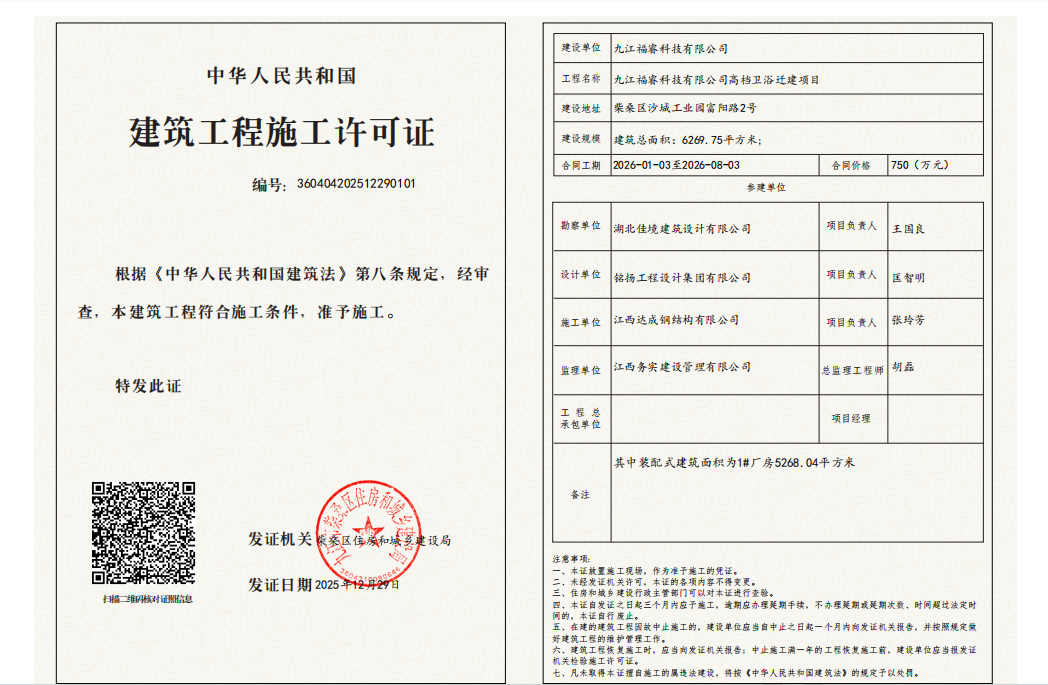 核发九江福睿科技有限公司高档卫浴迁建项目施工许可认证