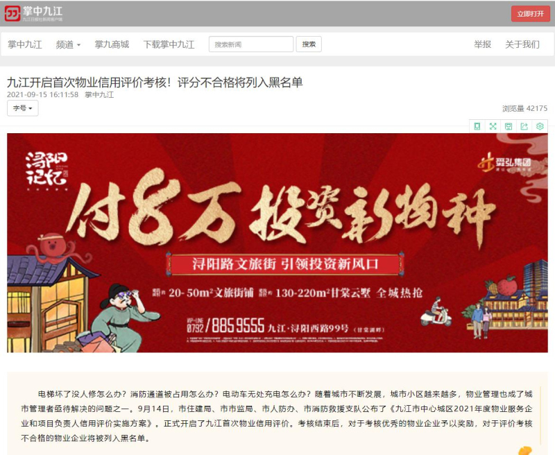 2021年9月15日起,人民日报、九江日报等多家媒体发布文章,对《九江市中心城区2021年度物业服务企业和项目负责人信用评价实施方案》进行解读。